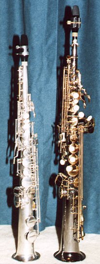 Here are 2 soprano saxes. The one on the left is a satin silver Buescher