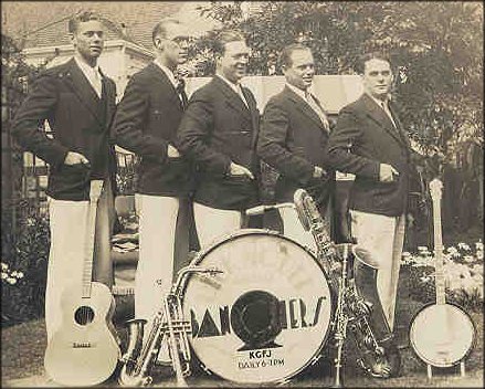 I can't quite make out the name of the band on the bass drum. But it looks like they had one reed player who played clarinet, alto sax, and baritone sax.