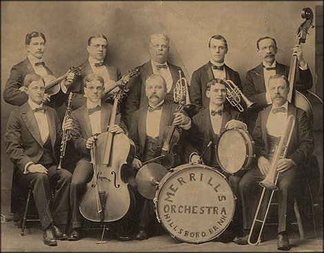 This is a photo of Merrill's Orchestra from Hillsboro, NH. The clarinet player is playing an Albert system instrument.