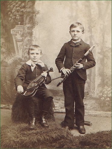 Here are a couple of young boys. The one on the left holding a violin, and the