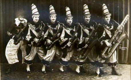 Here's an early sax ensemble. The members are wearing clown outfits, and one